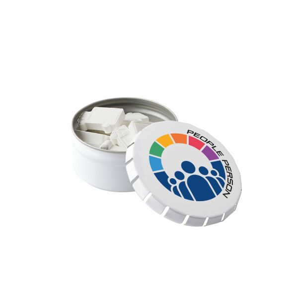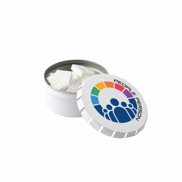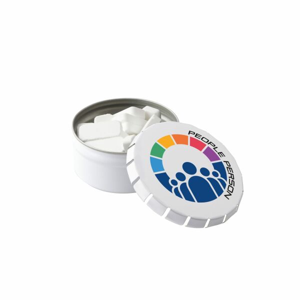 Wit hoog mini clic-clac blikje gevuld met ca. 23 gram Compli'mints. Voorzien van een full colour bedrukking, inclusief ingrediƫntensticker en seal